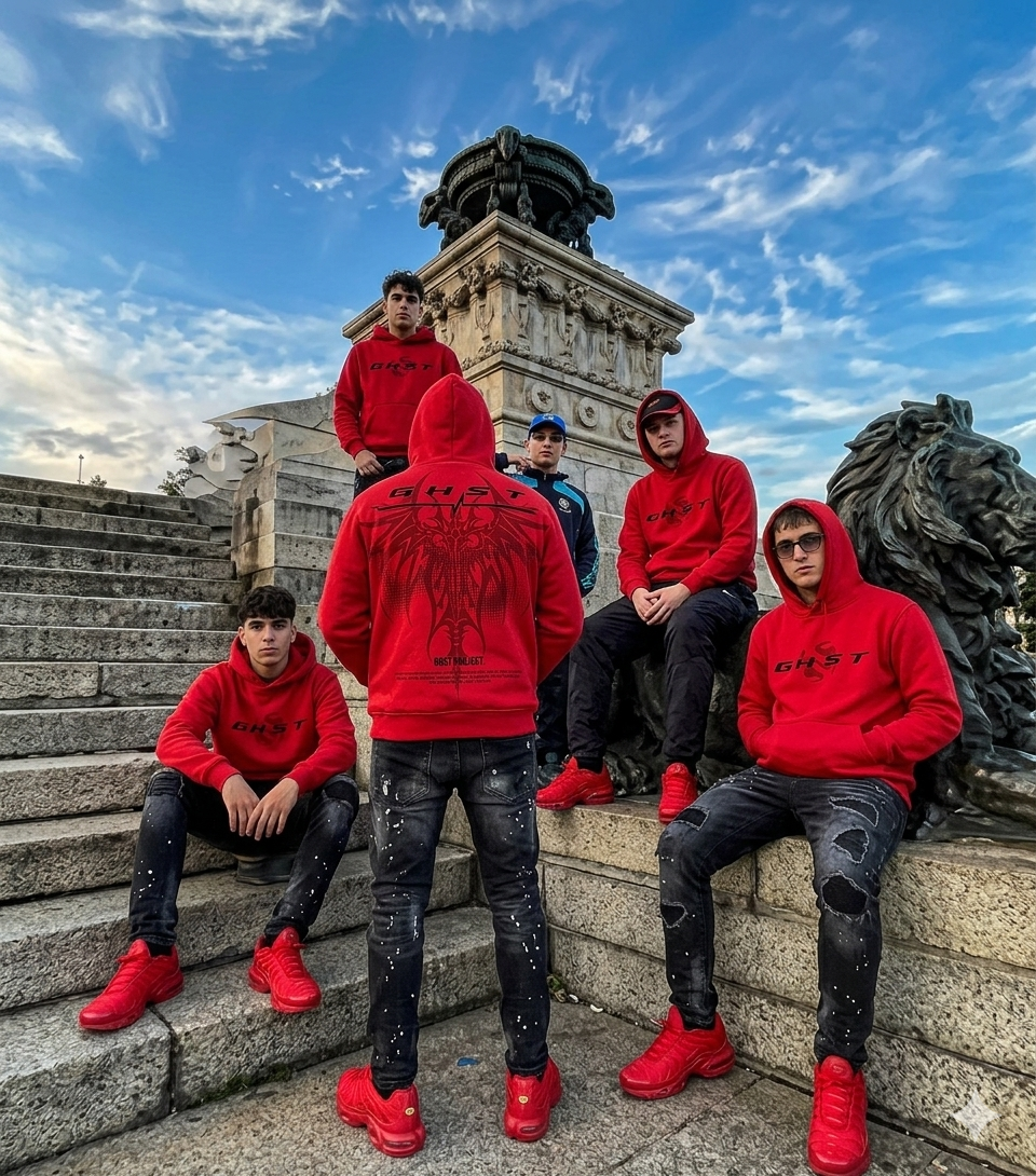 Onde a tecnologia encontra o instinto. O Phantom Hoodie destaca-se pelo seu tom "Deep Burgundy" e um design que evoca a precisão e a pulsação das ruas. Com o grafismo da linha de batimento cardíaco (heartbeat) integrado no logótipo GHST, esta peça representa a energia vital do movimento underground e a ligação inquebrável entre a marca e quem a veste.