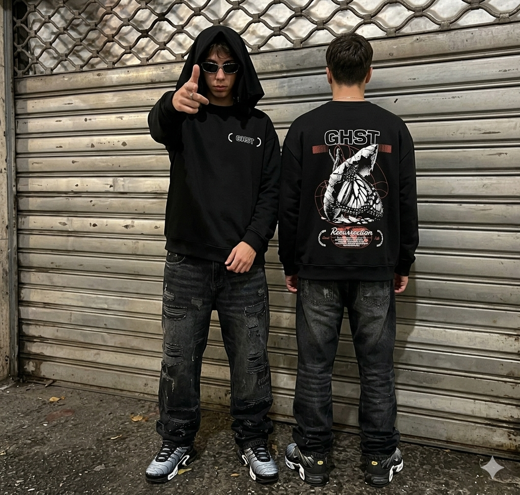 Corte: Relaxed Crewneck de alta gramagem, com gola redonda reforçada e punhos elásticos, oferecendo um caimento estruturado que destaca os gráficos traseiros.