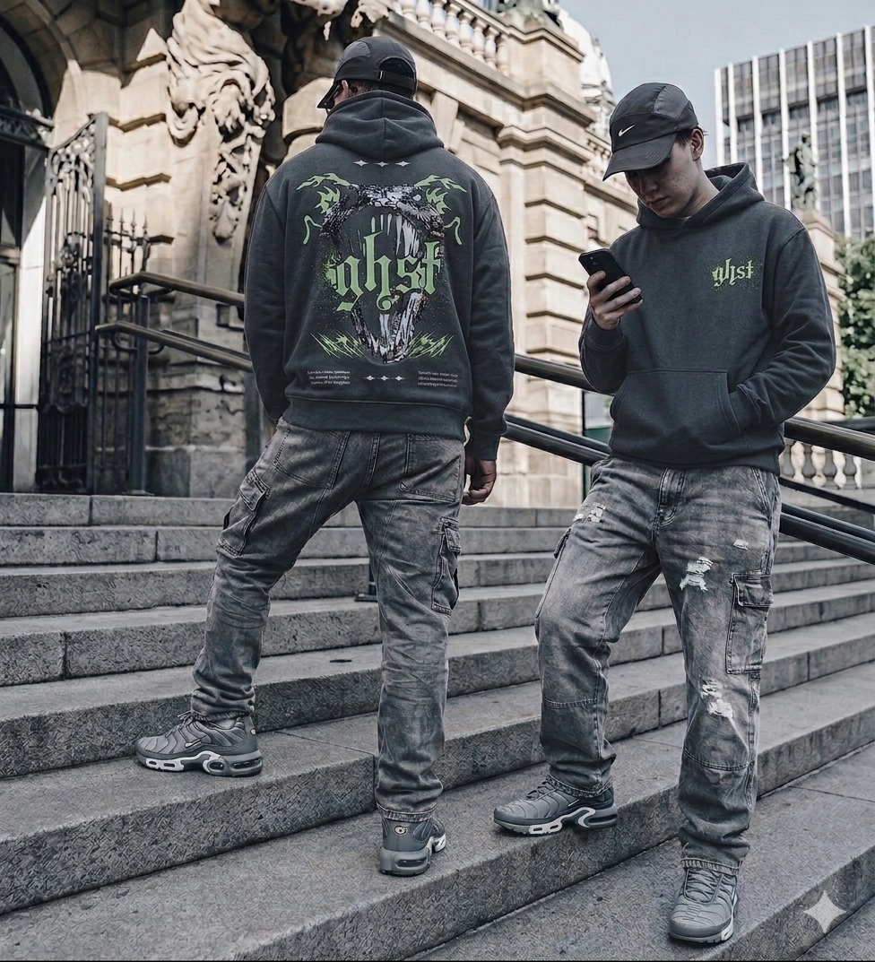 Onde a arte de rua e a alta moda alternativa se fundem. Este hoodie de alta gramagem não é apenas uma peça de inverno, é uma declaração de pertencimento a um clã que não pede licença para existir. O detalhe lateral e a composição das costas garantem que a tua identidade seja notada antes de qualquer palavra ser dita.